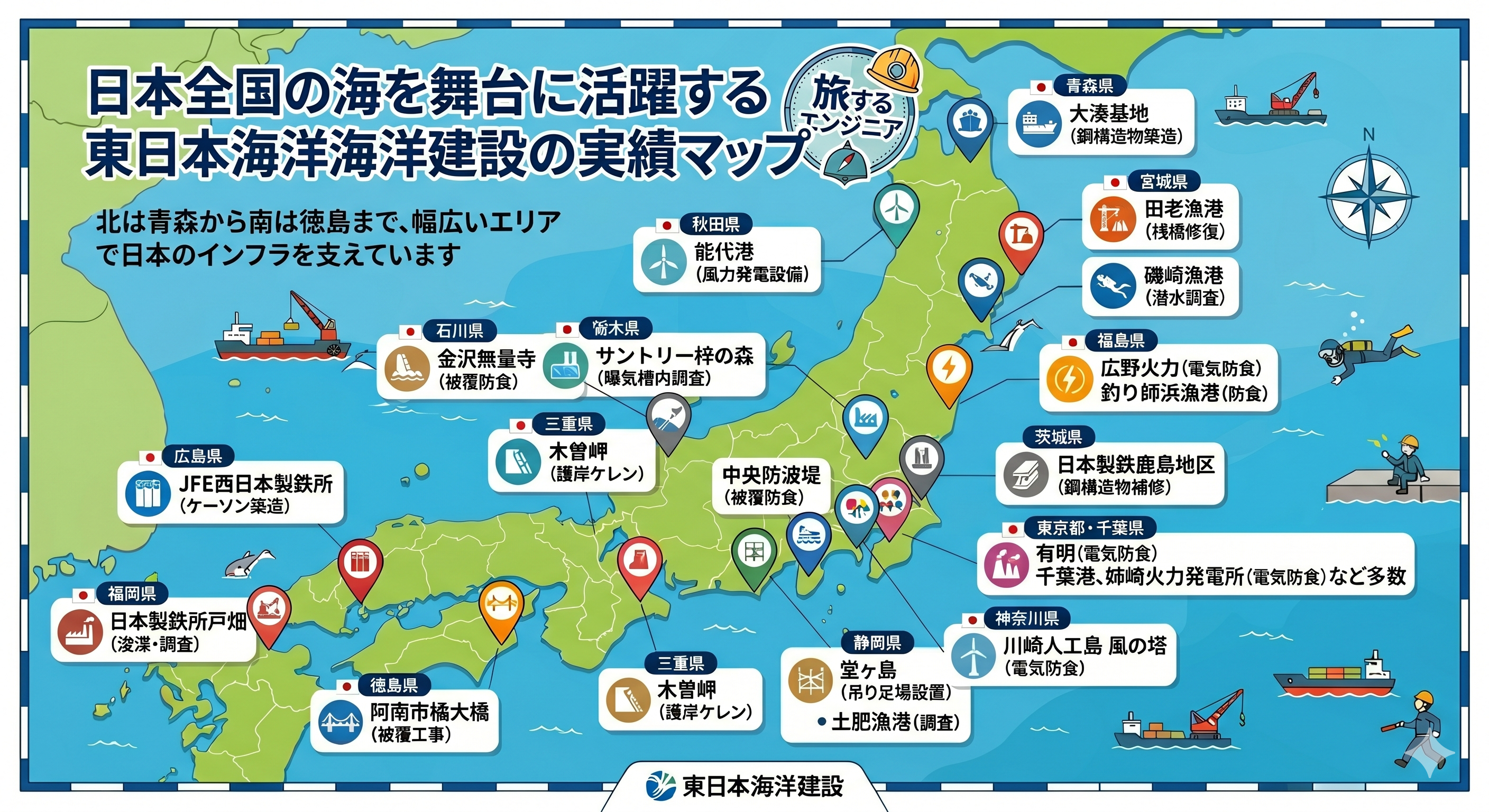 私たちの仕事場は、決まったオフィスではありません。ある時は秋田の風力発電の拠点へ、またある時は徳島の巨大な橋のふもとへと、プロジェクトごとに日本中の海を巡ります。