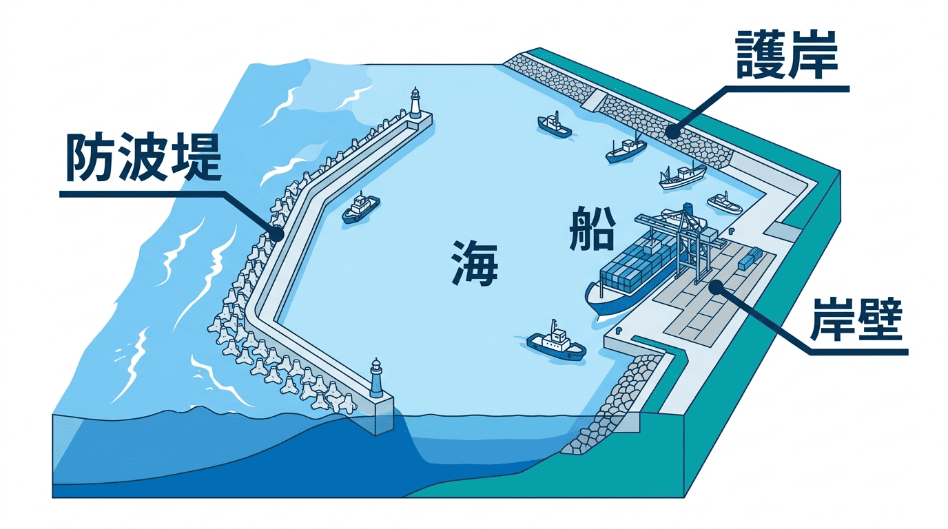 港湾工事には、防波堤・護岸・岸壁の整備と浚渫・消波ブロック設置などがあります。構造物の新設から維持管理まで幅広く、それぞれ異なる役割を持っています。