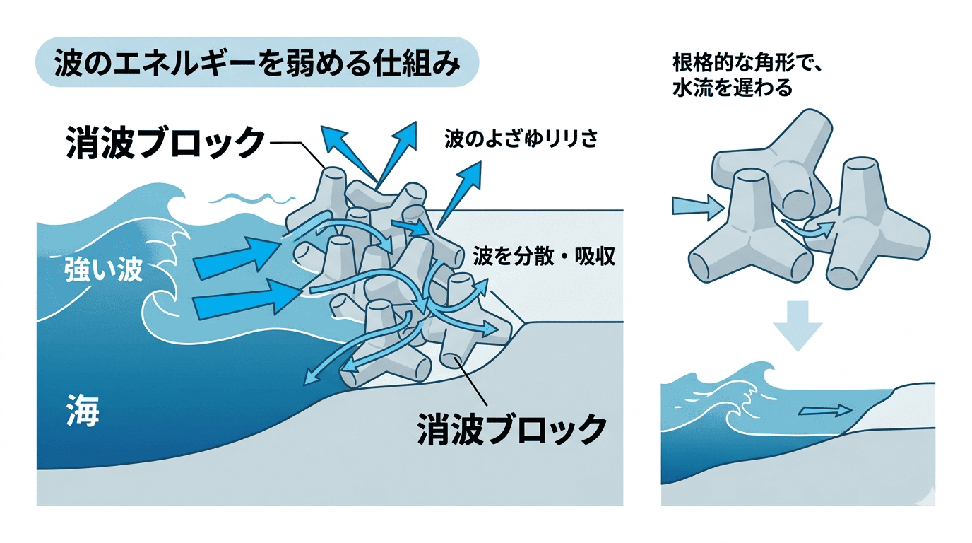 独特の形状には、複雑に絡み合って安定を保つ工学的な理由があります。詳しくは「消波ブロックの大切な役割と海洋土木の関係とは」をご覧ください。