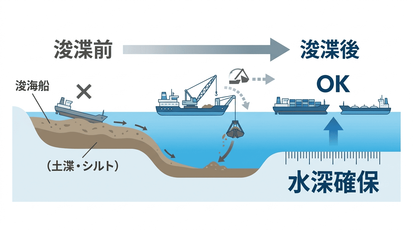 港の水底に堆積した土砂を掘り出し、水深を維持する、物流を守る重要な維持管理工事です。