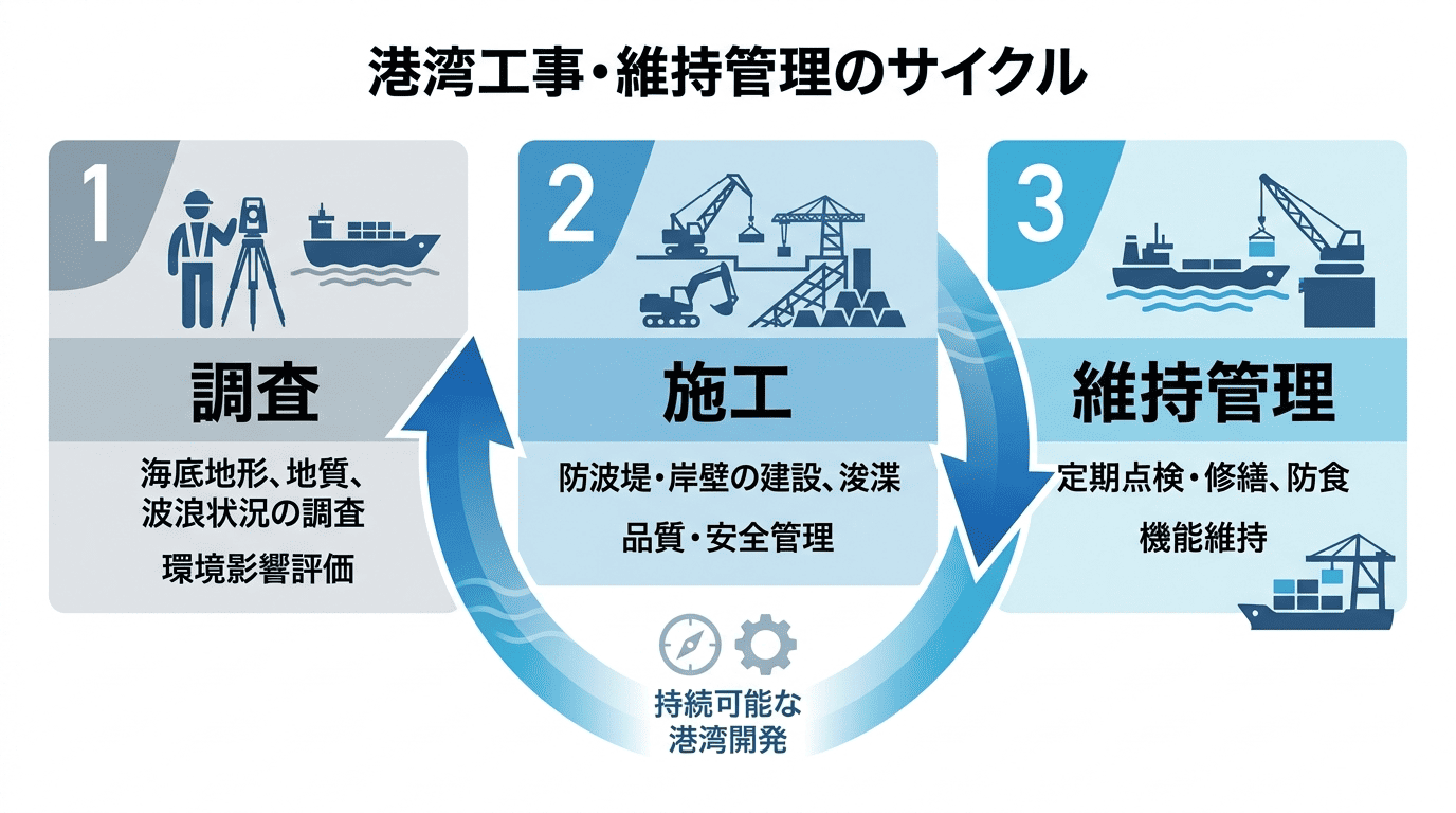 港湾工事は「調査→施工→維持管理」の3段階で進みます。