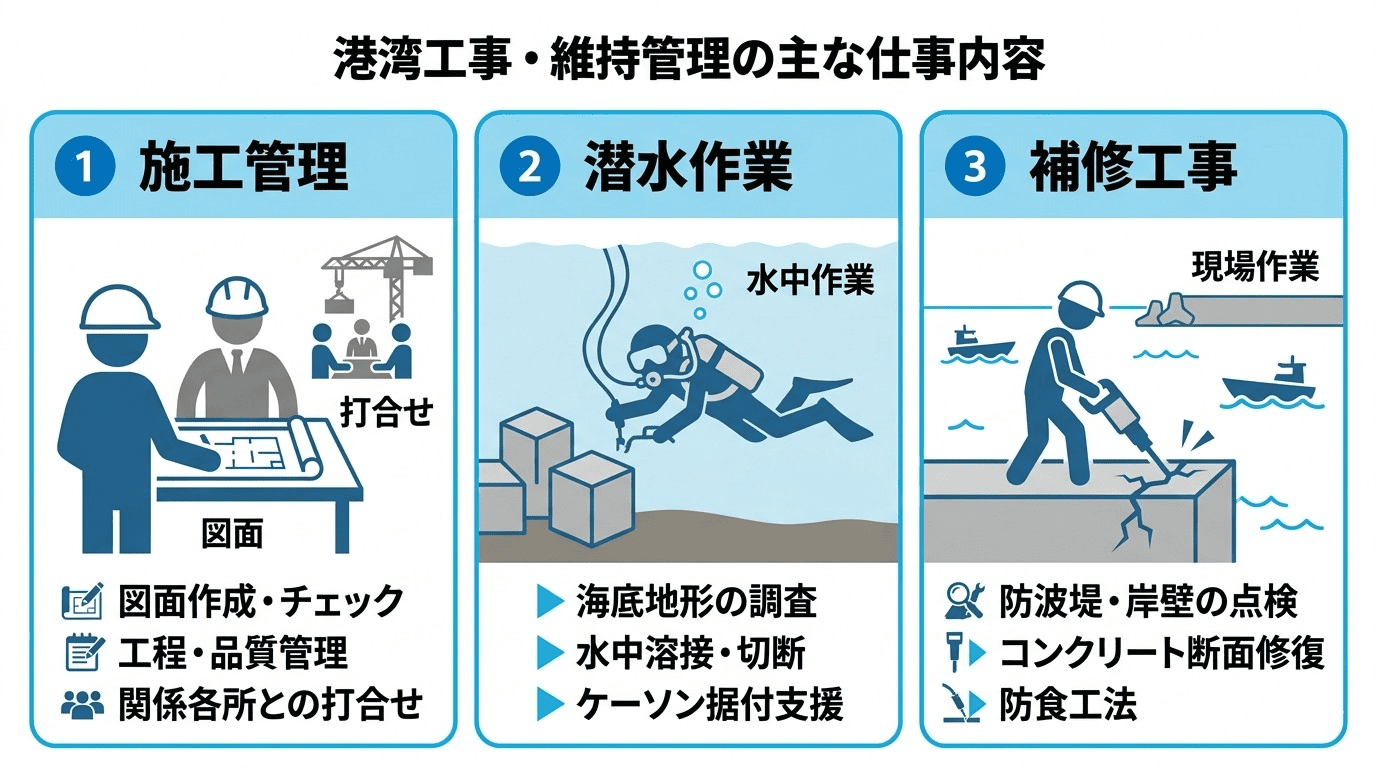 港湾工事の仕事は、施工管理・潜水作業・補修工事の3つが中心です。また、工事は「調査→施工→維持管理」という流れで進み、海洋特有の技術が現場を支えます。