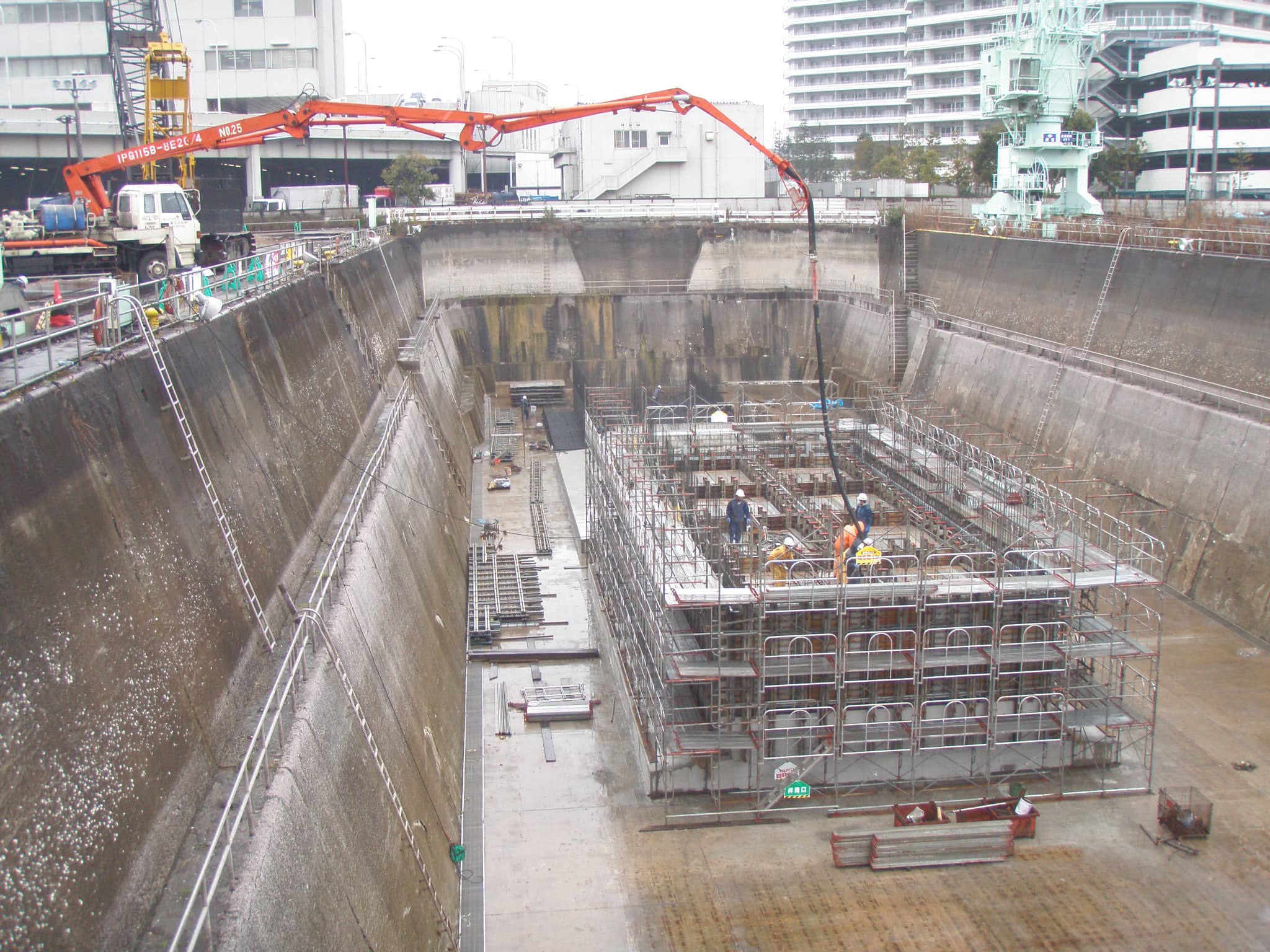 巨大な鉄筋コンクリート製の箱(ケーソン)を沈設し、その内部を掘削しながら地盤に支持させることで、安定した橋脚基礎を築造することができます。ケーソン工法は、大水深や複雑な地盤といった、制約された条件のもとでも適用が可能なため、大型橋梁の建設に欠かせない工法となっています。