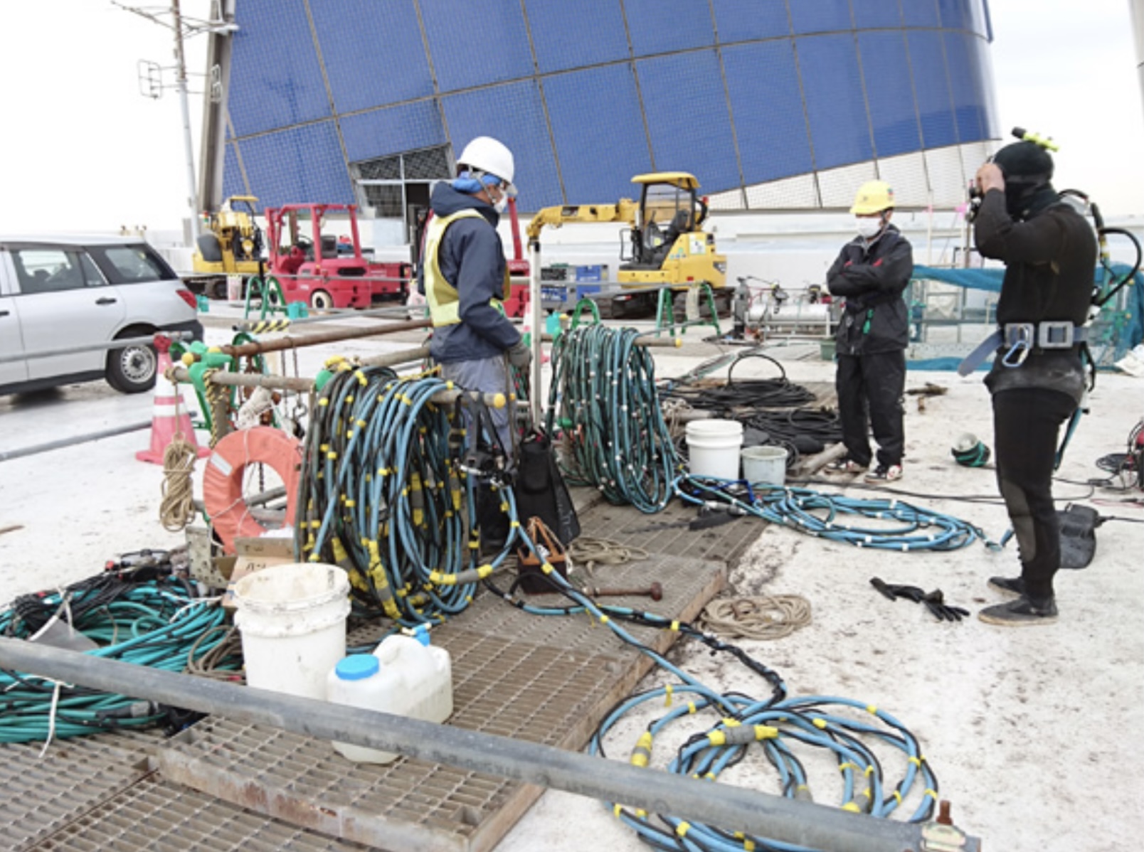 - プロの潜水作業: 水の中は機械だけでは限界があります。熟練の潜水士が潜り、自分の手で確認しながら作業を進めます。