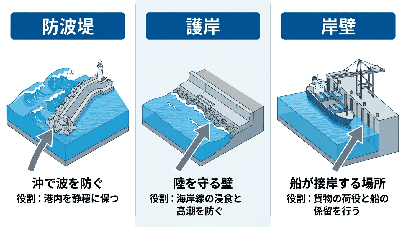 港湾工事には、防波堤・護岸・岸壁の整備と浚渫・消波ブロック設置などがあります。構造物の新設から維持管理まで幅広く、それぞれ異なる役割を持っています。