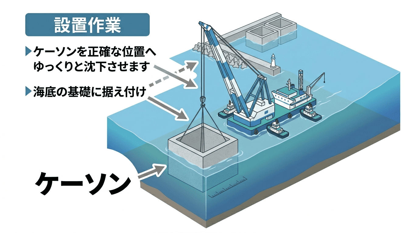 - 主な工事の種類は、消波ブロック設置・浚渫・防食・ケーソン工法など
