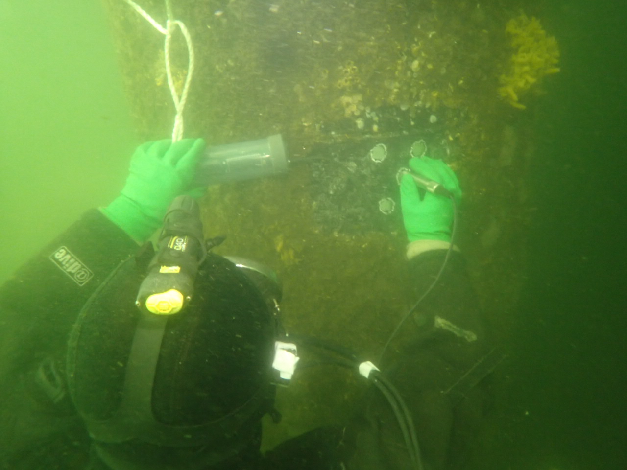 - 水中超音波厚さ計の活用:従来は陸上で厚み測定機を置いて測定端子を水中専用端子に交換し測定を行っていました。従来方法だと測定機と測定端子が有線の為、測定機と測定場所に距離的制限がありましたが、「水中超音波厚さ計」は測定機ごと水中に持ち込むことが出来る為、距離的制限がなく潜水士が潜水可能な場所であればどこでも測定することが出来ます。その為、目視だけでは判断不可能な劣化を測定機を当てるだけで数値化しコンマミリ単位まで計測すること出来ます。